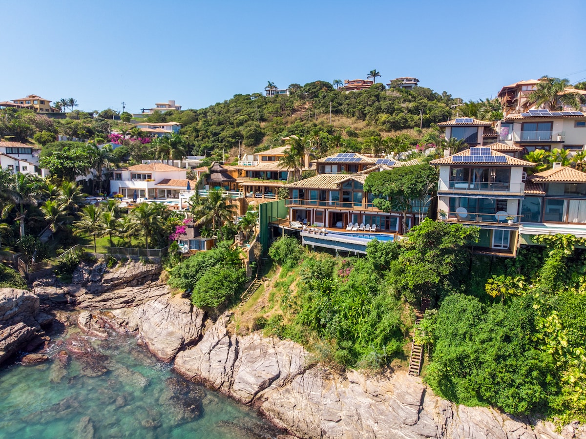 Casa de sonho com linda área social com piscina, sauna à vapor, terraço com linda vista e espaço agradável coberto com churrasqueira e lavabo. Com duas salas de estar, sala com TV de 70 pol., cozinha completa com sala de jantar, lavabo e quatro confortáveis suítes. A casa tem uma vista do mar fantástica! Perto de quatro praias e da Orla Bardot, que leva à pé à Rua das Pedras. Casa extremamente charmosa e sofisticada! Acomoda um máximo de oito adultos e quatro crianças (até 12 anos de idade).