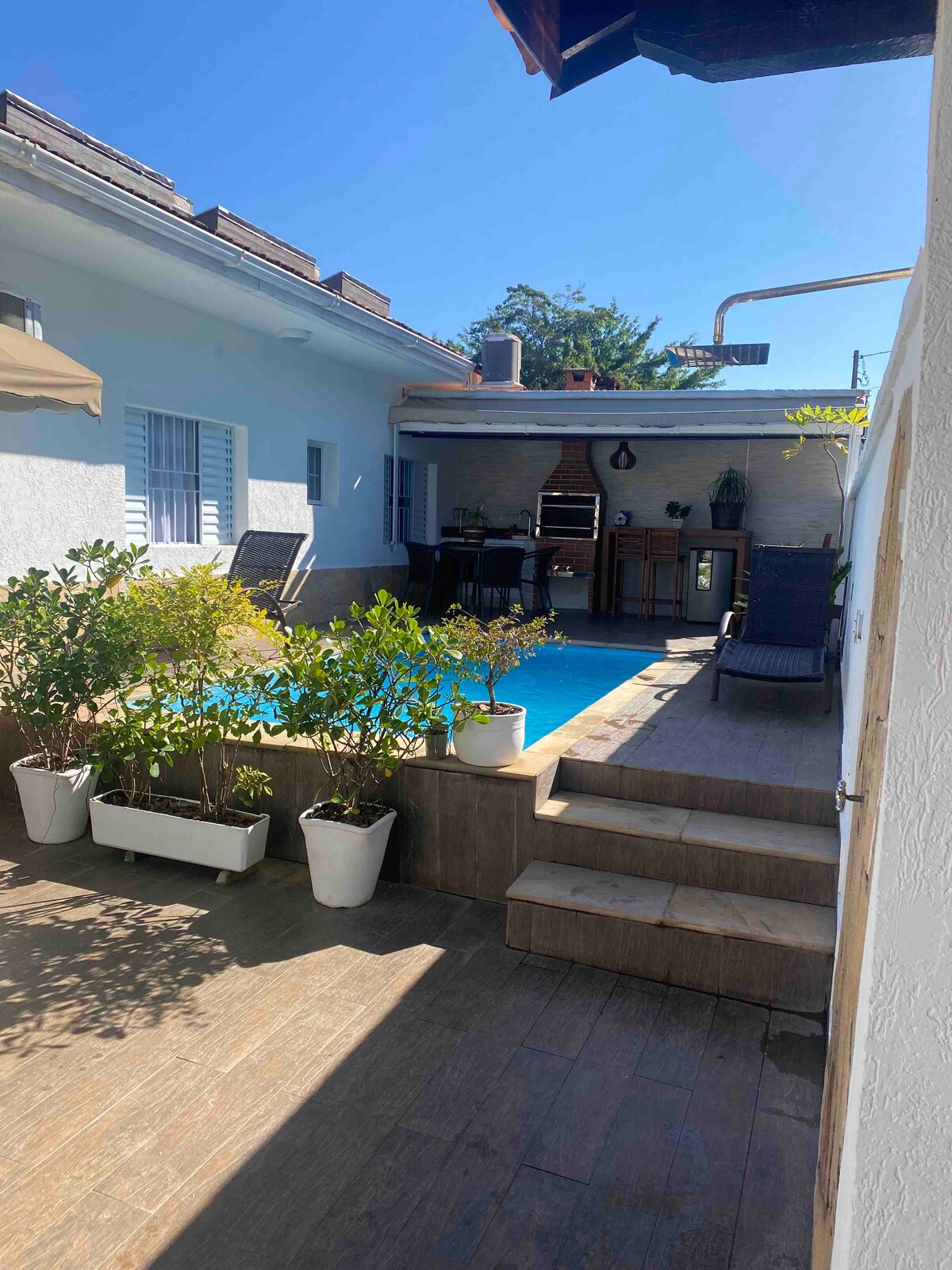 Casa com piscina com 3 dormitórios sendo 2 suítes, acomodação para 8 pessoas, 1 sala, churrasqueira, próximo da praia, ótima localização, próximo ao Shopping Monjolo, restaurantes. Ar condicionado em todos os quartos e sala. Garagem para 2 Carros