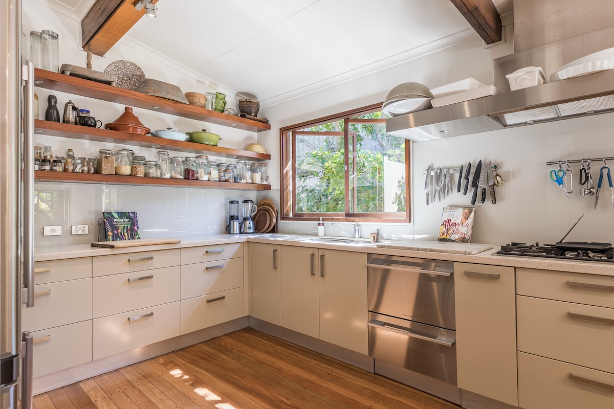 Welkom bij White at Home Cottage. Het huisje is ontworpen met het oog op comfort en heeft een ontspannen, relaxte sfeer. Perfect voor een meidenweekend, een verblijf voor koppels of een gezinsbijeenkomst. We willen je het gevoel geven dat je 'thuis' bent, dus geniet van het buitenbad, zachte witte handdoeken, badzout en badjassen. Ontspan op de veranda met je ochtendkoffie en geniet van het uitzicht op de tuin. Omdat de stad op vijf minuten rijden ligt, is het supermakkelijk om te genieten van alles wat Mullumbimby te bieden heeft.