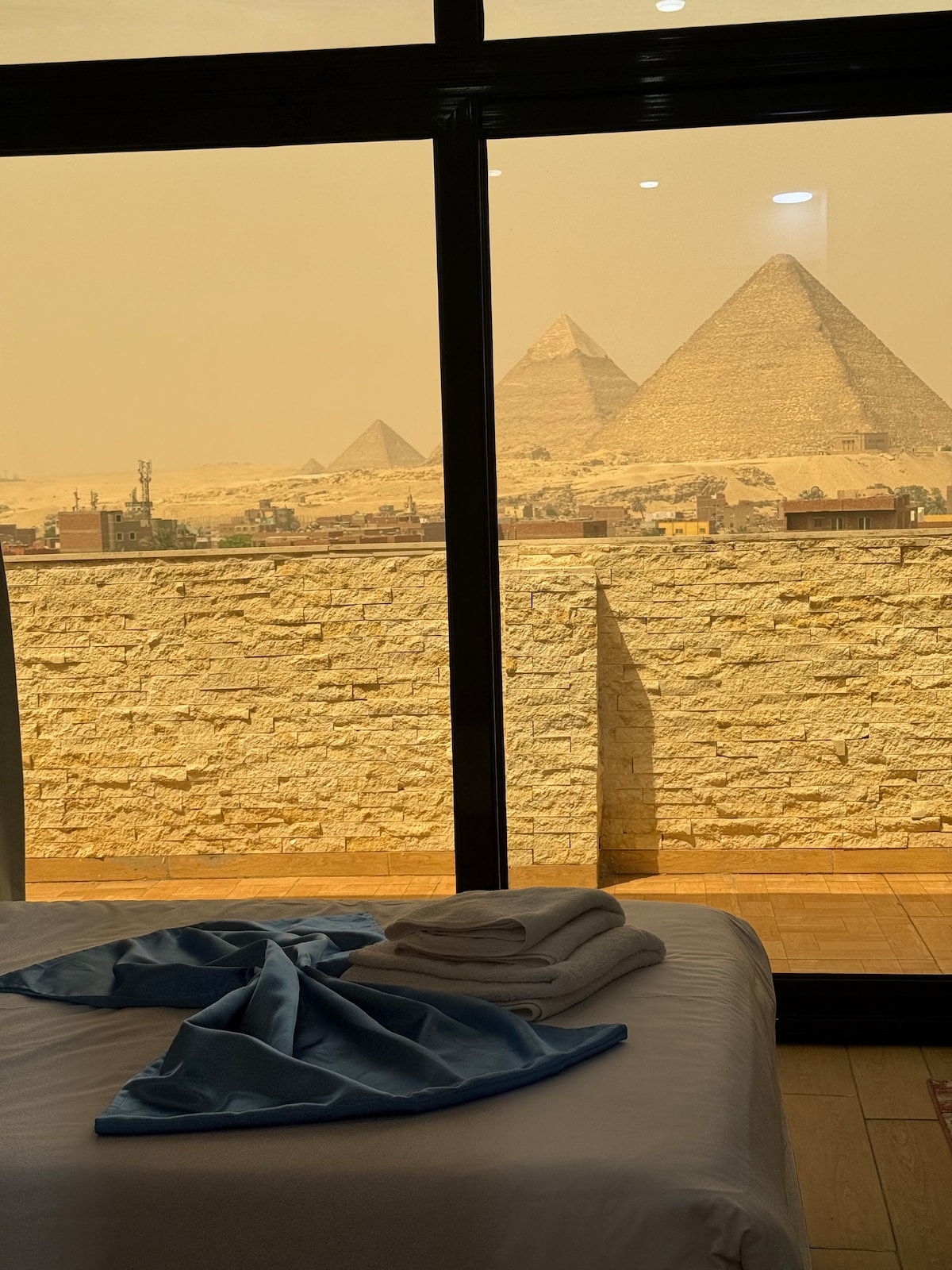 eenpersoonskamer met een prachtig uitzicht op de grote piramides van Gizeh