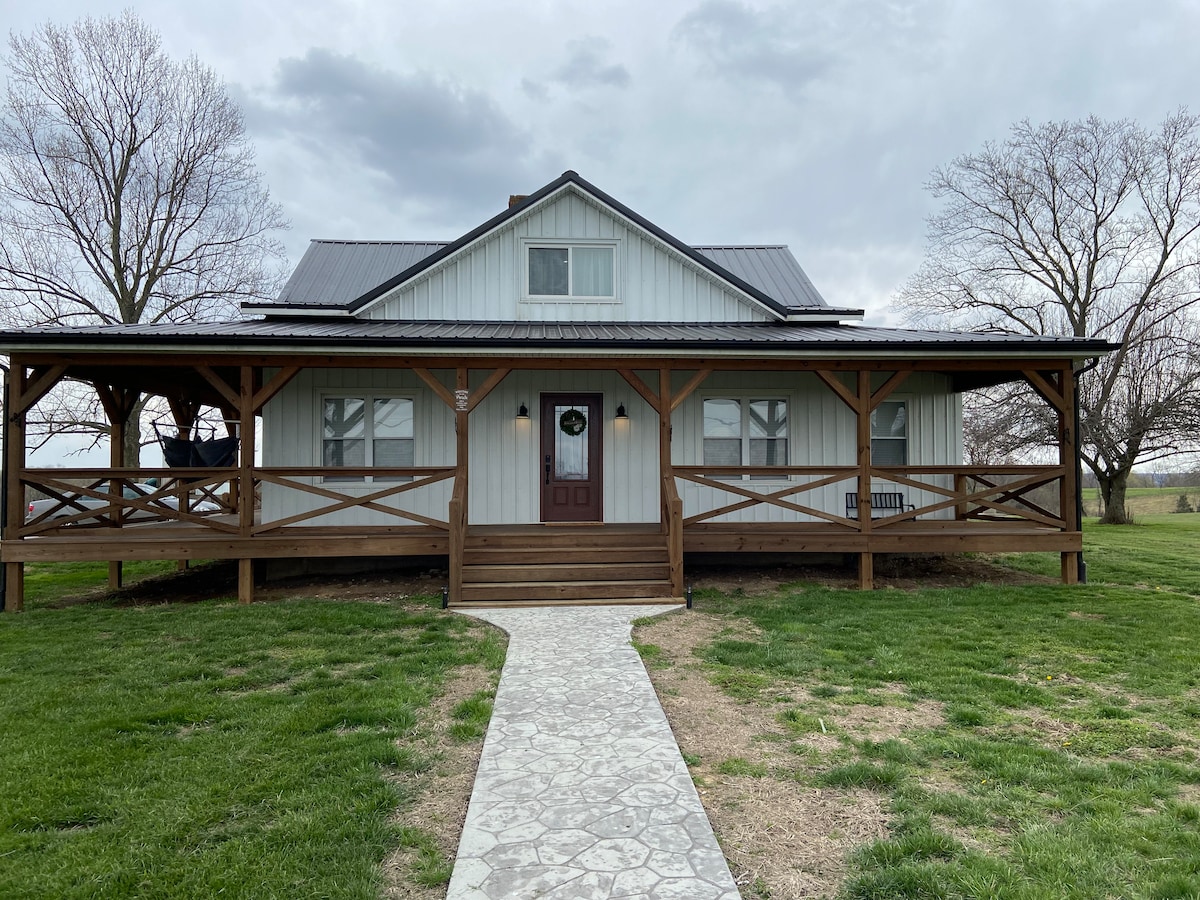 Discover the charm of our rustic container cabin on a wooded ridge of our family farm. Freshly painted exterior—same comfy interior. 30 min to Ark Encounter. Unwind on the sunset porch under string lights, enjoy the fire pit & grill, and breathe crisp Kentucky air as you explore 200 acres of hills and trails. Inside: vintage farm touches, comfy memory-foam bed(s), efficient kitchenette, heat/AC, and a one-of-a-kind bath. A peaceful base for the Ark and Boutbon Trail. A true Kentucky farm stay.