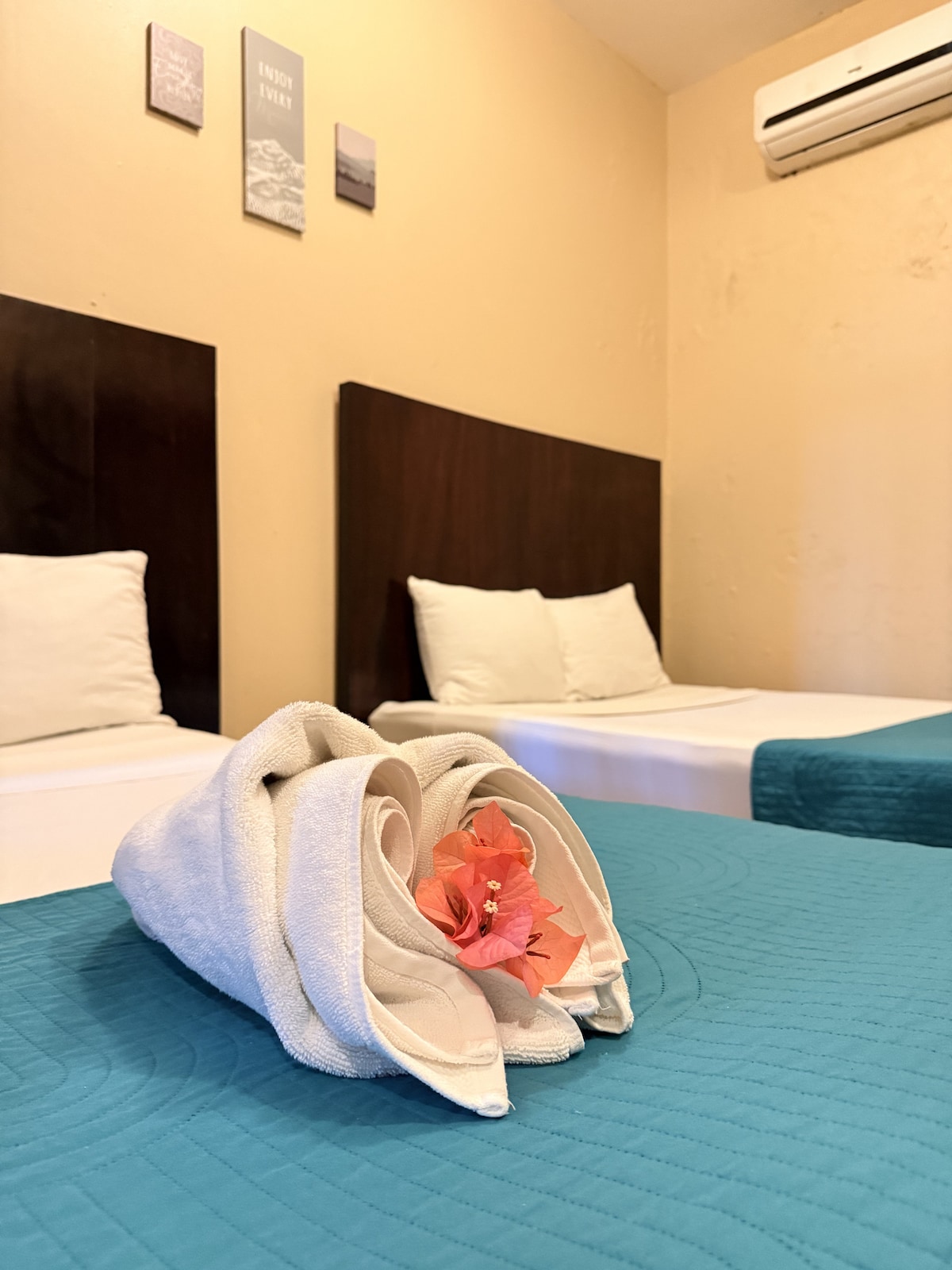 Disfruta de una estancia cómoda en nuestra habitación familiar ideal para grupos o familias que buscan descanso y ubicación estratégica en Petén. Cuenta con varias camas que permiten alojar cómodamente a varios huéspedes. Relájate después de un día de exploración y disfruta de un balcón con vista a la calle, perfecto para tomar aire o simplemente desconectar. Además, tendrás acceso a: -Piscina, Restaurante y Parqueo privado -Atención en recepción - Ubicación conveniente cerca de puntos clave