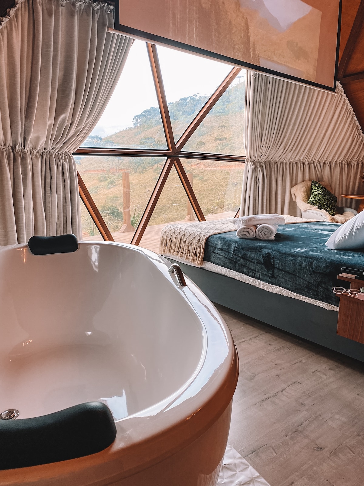 Ontbijt inbegrepen. De koepel ligt midden in een berg, met een bevoorrecht en spectaculair uitzicht op de heuvels en bergen van Antônio Carlos. Ons pand is een echte parel omgeven door de inheemse vegetatie van het Atlantische Woud. De koepel heeft een bad met verwarmd bubbelbad, airconditioning, tv, internet en keuken. Gemeenschappelijke recreatiegebieden zijn onder andere een zwembad, verwarmde bubbelbaden, eco-track, barbecue en nog veel meer.