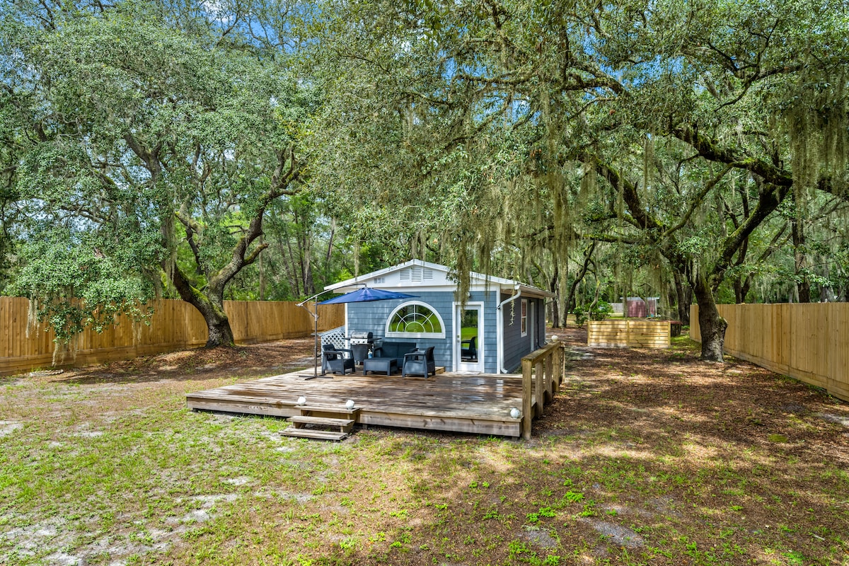Geniet van een prachtig uitzicht op het meer terwijl je geniet van je ochtendkoffie op het achterdek. Veel peddelmogelijkheden zijn hier op het voorjaar gevoede Sand Lake. Verhuurders bieden een peddelboot, kano en paddleboards voor je plezier. Oefen yoga op je eigen privé terras, vis uit het dok of kijk elke avond naar de sterren rond het kampvuur. Ontdek de nabijgelegen Florida Springs en stranden allemaal binnen 30 - 60 min. Dit 800 vierkante meter grote huisje is centraal gelegen tussen Gainesville en Saint Augustine. Netflix | Hulu | wifi | BBQ