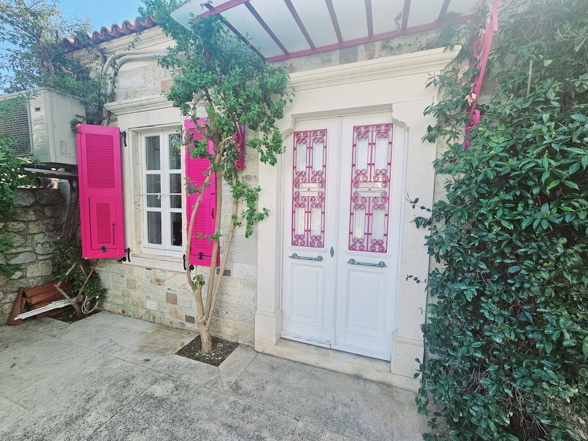 Bu şirin Taş Ev, Foça Merkez'de, plaja, tüm süpermarketlere, dükkanlara, kafe ve restaurantlara 5 dk. yürüme mesafesinde. 2 ayrı katta birer mutfak, banyo ve salon mevcut. Bir çift kişilik ve bir tek kişilik yatak odası var. Ön balkonda ve alt katın bahçesinde 6'şar kişilik yemek masası bulunuyor. Dilerseniz, özel dizayn edilmiş alanda OCAKBAŞI keyfi de yapabilirsiniz. Tüm mangal malzemeleri mevcut.