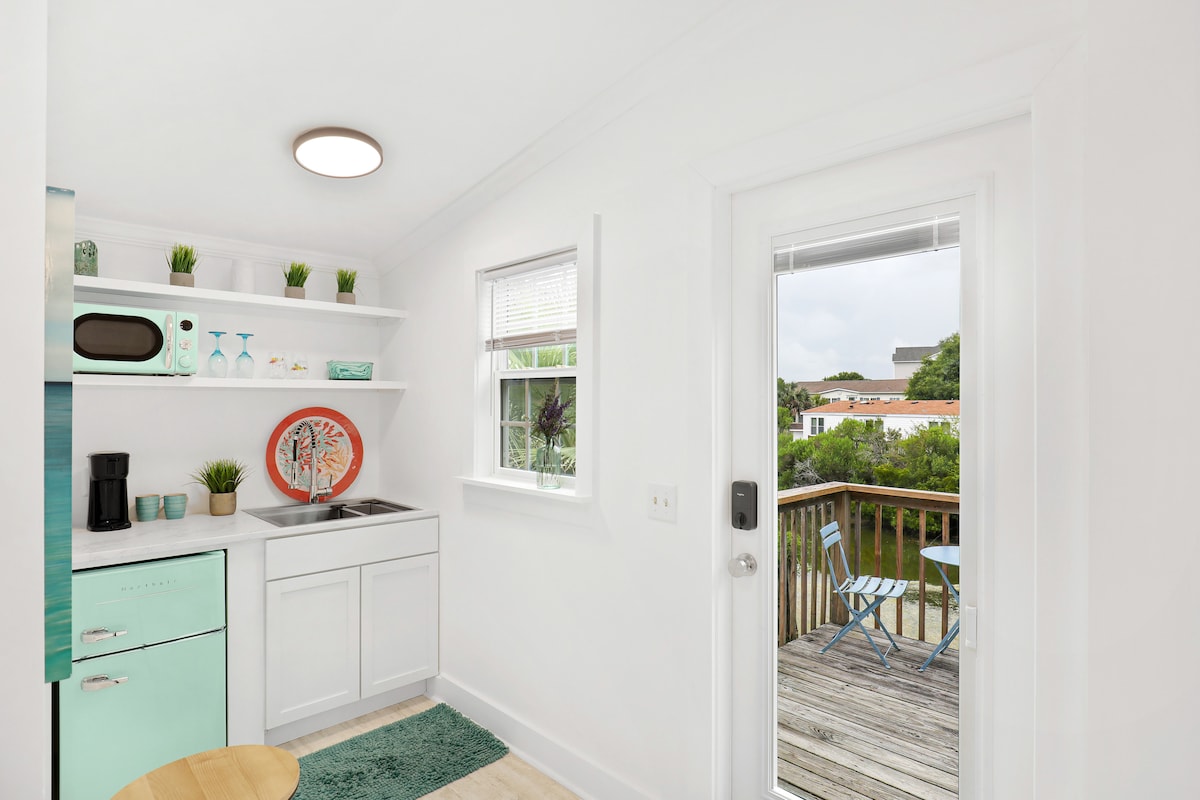 Modern, funky studio appartement gelegen tussen Folly Beach en het historische centrum van Charleston. Het terras met uitzicht op de vijver van de buurt is perfect voor je kopje koffie in de ochtend of een cocktail bij zonsondergang. Binnen is een schone en rustige leefruimte. De oceaan, zand, surfers en dolfijnen liggen op slechts twee mijl afstand, waar je ook geweldige restaurants, winkels, muziek en de Folly Beach-pier kunt vinden. Perfect voor koppels of een soloreiziger.