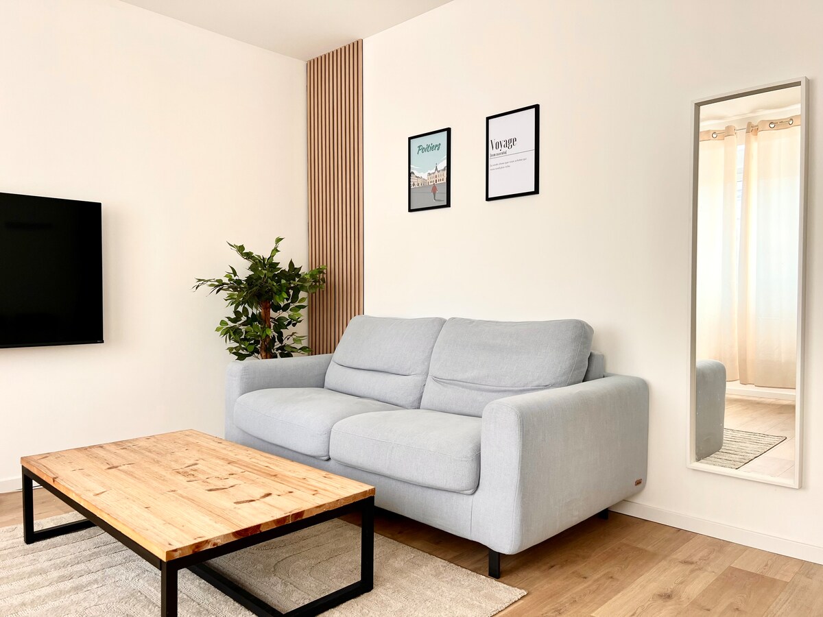 Rustig, Place de la Liberté en op 2 stappen van het marktplein, de Notre Dame-kerk, voetgangersstraten, op 3 minuten lopen van de rectoraat, IAE, restaurants en het historische centrum van Poitiers, gemakkelijke toegang tot alle bezienswaardigheden en voorzieningen: je bevindt je op 10 minuten lopen van het treinstation, 10 minuten met de auto en 30 minuten met de bus van Futuroscope, dicht bij alle buslijnen van de stad waarmee je overal naartoe kunt! Het appartement met 2 kamers is geschikt voor 4 personen.