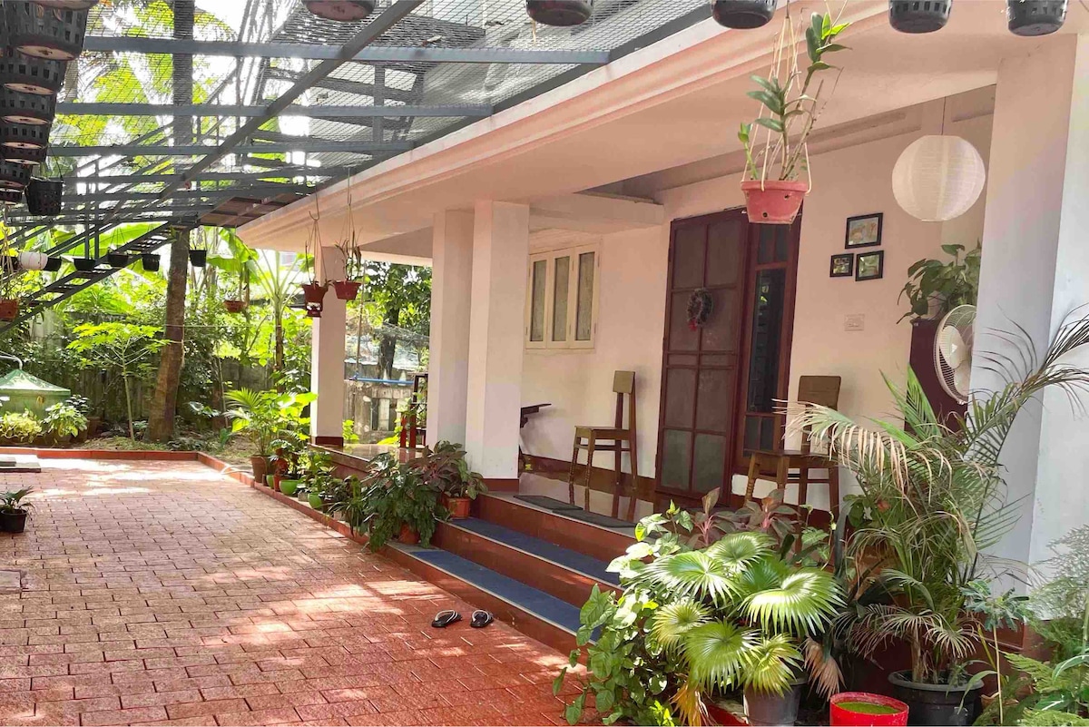 Geniet van je vakantie in dit gezellige huisje in retro-stijl ( een slaapkamer met airconditioning, een keuken en een badkamer )in een grote rustige tuin met veel groen. Het is voorzien van een ruime gang met uitzicht op prachtige tuin en gazon waar je kunt genieten van je kopje warme thee. Je kunt ook genieten van het uitzicht op onze eeuwenoude mangoboom, een enorm gazon en een duivenhuis om je perfecte dag te beginnen. Het ligt op een perfecte afstand van het strand en de belangrijkste toeristische attracties in zowel Fort Kochi als Mattancherry.