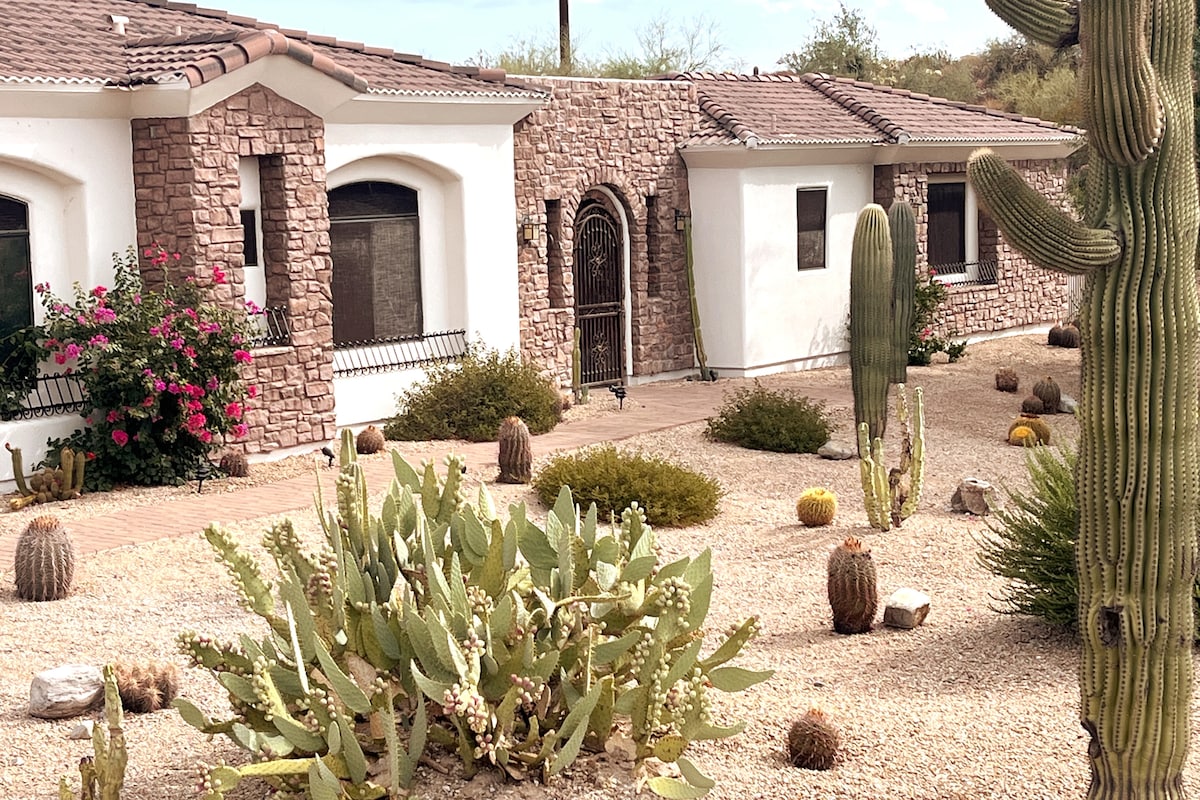The Hill 's Bungalow, een heerlijk charmante casita met een aparte ingang en parkeren. Loop 's ochtends naar buiten, kijk naar de zonsopgang en zit op de eigen veranda aan de achterkant voor zonsondergang. Aangepaste afwerking en grote ramen openen naar een gastronomische keuken/ grote gemeenschappelijke ruimte, een half bad, 50inch tv en snelle wifi. Een kingsize bed met slaapnummer en een weelderig volledig bad, maakt ontspannen gemakkelijk. Wandelen naar wandelpaden, twee minuten rijden naar het centrum van FH, tien minuten naar Scottsdale of 35 minuten naar Sky Harbor.