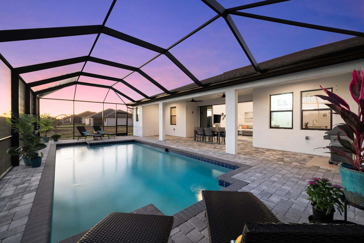 Ontsnap naar Cape en geniet van een rustig ontspannen verblijf in dit nieuwe ruime en moderne huis met 4 slaapkamers (2 kingsize suites), 3 badkamers met een oversized verwarmd zwembad aan een zoetwaterkanaal. Deze woning beschikt over een gedeelde slaapkamer plattegrond en een goed ingerichte keuken, groot eiland met uitzicht op een luchtige woonkamer die uitkomt op het enorme zwembad/lanai gebied voor een echte binnen-buitenwoning. Verblijf in een wenselijk deel van Cape Coral, handig voor twee luchthavens, jachthavens, stranden, restaurants, winkels en gastronomische supermarkten.