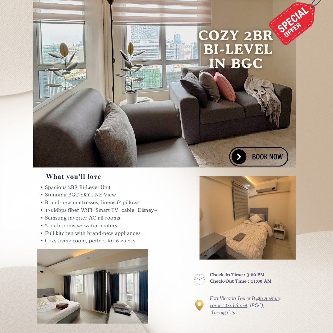 Maak een vroege ochtendwandeling langs de miljonairrij van Bonifacio Global City, waar alles op steenworp afstand ligt. Bereikbaar naar het langste stadspark in Metro Manila - het BGC Greenway Park, Las Flores, Wildflour, Burgos Circle, One Bonifacio Mall en nog veel meer beroemde restaurants en etablissementen in Fort Bonifacio BGC. We hopen dat je je thuis voelt met onze volledig gemeubileerde loft van 45 m ². Ideaal voor reizigers, koppels of iedereen die wil genieten van een rustig uitje.