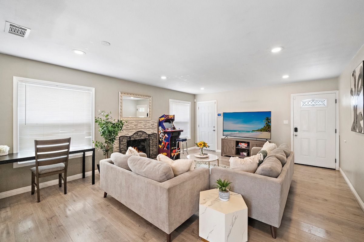 Nieuw ingerichte moderne woning centraal gelegen in een rustige en veilige buurt in Santa Ana. Deze schattige en gezinsvriendelijke woning heeft een volledig gevulde keuken, badkamers en centrale airco, alles wat je nodig hebt voor een langer verblijf. Minder dan 10 mijl naar het grote winkelcentrum, parken, Little Saigon, Huntington Beach, Newport Beach, Disneyland, Great Wolf Lodge en nog veel meer!