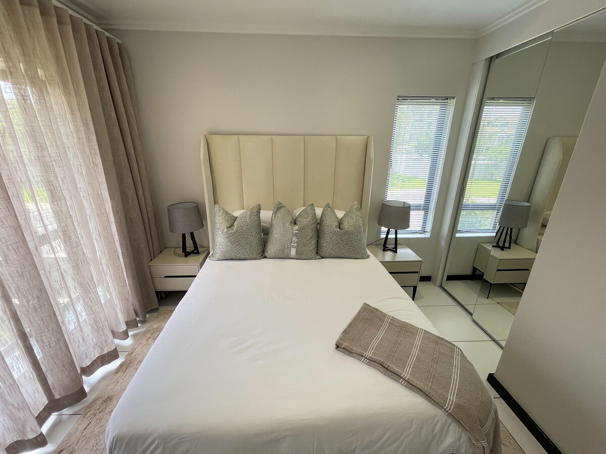 Welkom in je serene ontsnapping in de stad!Dit prachtig ontworpen appartement op de begane grond met 2 slaapkamers biedt comfort, elegantie en gemak. De hoofdslaapkamer heeft een queensize bed en de slaapkamer heeft een tweepersoonsbed, beide met pluche linnengoed en elektrische dekens. De moderne badkamer heeft een ruime douche en een ontspannend bad. Geniet van de volledig uitgeruste keuken en de stijlvolle open woonkamer, versierd met Afrikaans geïnspireerde kunst. Stap naar buiten naar je privétuin - een rustige oase om te ontspannen na het verkennen.