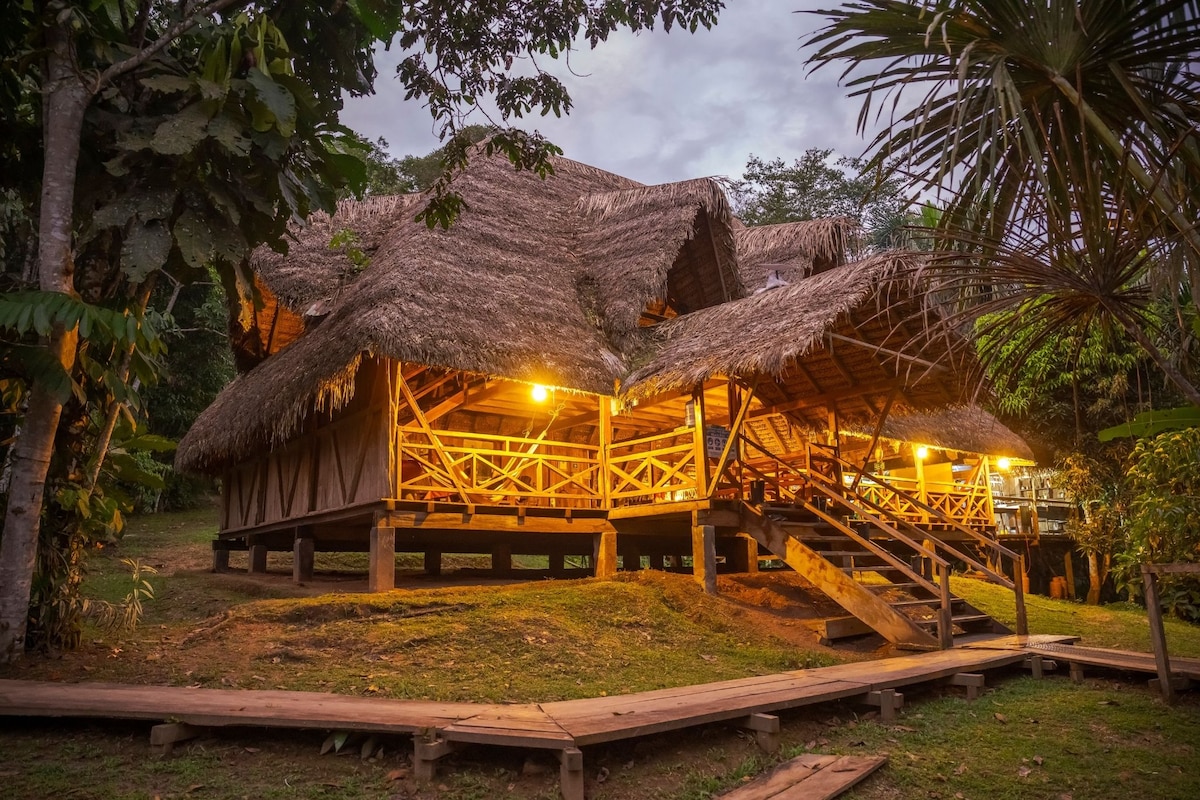 Een enorme hut xon capaciteit tot 20 personen, voor avonturiers die de echte Amazone willen ervaren. Beheerd door de Siekopaï Nation, geniet van de Aguarico-rivier, jungle-excursies, sportvissen, boomgaard (professioneel klimmen van eeuwenoude bomen), medicinale planten, roze dolfijnen kijken, piranha vissen en bezoeken aan nabijgelegen reservaten zoals Cuyabeno. Perfect voor groepen en evenementen. Een lokale gids is inbegrepen in de hele
