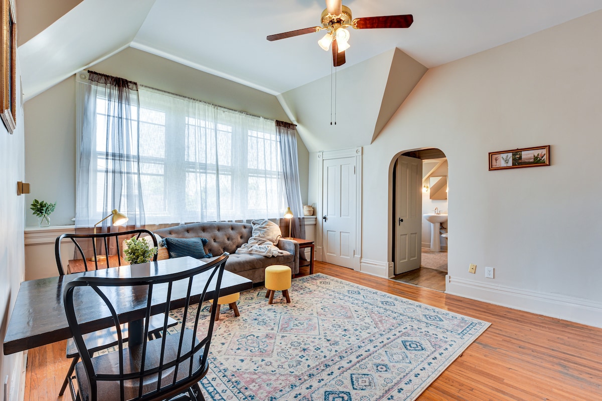 The Retreat ligt op de 3e verdieping van het historische Judge's Mansion en biedt plafonds van 10', hoge ramen met verduisterende gordijnen, een eigen badkamer en een volledige in-suite keuken. Het is een rustige, fotoklare schuilplaats in warme tinten met een knipoog naar de roots van de woning uit de jaren 1890, perfect om te ontspannen na het verkennen van Columbus. Perfect gelegen in de buurt van vele ziekenhuizen/universiteiten/centrum, verwelkomt een langer verblijf. Geschiedenis buiten, comfort binnen.