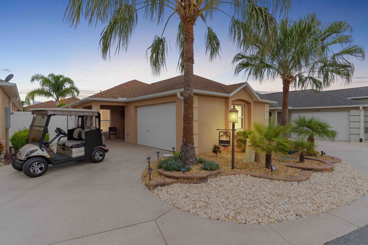 Enjoy a stylish experience at this centrally located 3-bedroom home. 5-7 minutes golf cart ride from Sumter Landing, 15 minutes from Spanish Springs Square, 20 minutes from Brownsville Square. 200 Community pools some for adults only and some for families. 13 Recreation Centers with Pickle Ball, Shuffleboard, Billiards, Study groups, etc. 3 Old Fashion Town Squares with nightly Live entertainment. 44 Golf Courses
