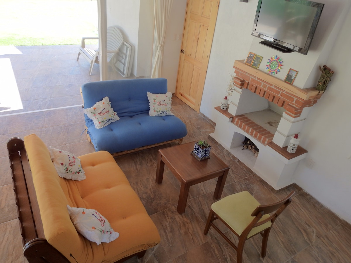Bungalow voor 4 personen gelegen in de prachtige cactustuin van een woonhuis in een privé en veilige wijk op 15 minuten van het dorp Tequisquiapan. Linda terraza met grill, enorme tuin met hangmatten en uitzicht op de kassen en goddelijke tuin. Parkeren buiten het huis, optioneel extra ontbijt, wasmachine en droger ook extra optioneel.