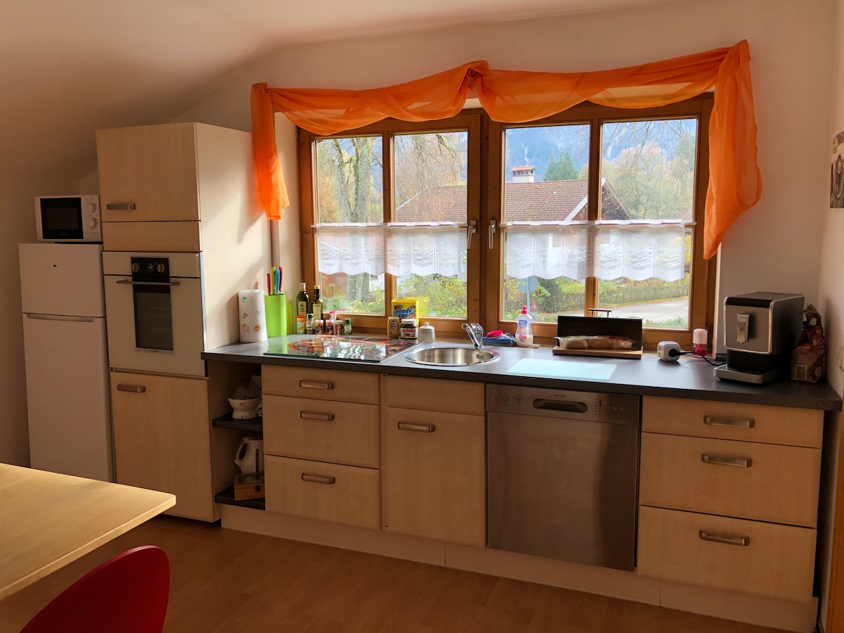 Het liefdevol ingerichte, lichtovergoten appartement met een eigen ingang vanuit de tuin is gelegen in een nederzettingshuis op de Halblech. Het is 43 m², woon- en slaapgedeelte zijn niet gescheiden door een deur. Het appartement is geschikt voor stellen of gezinnen met maximaal twee kinderen. Een tweepersoonsbed, 180 x 200, en een slaapbank 140 x 195 bieden veel ruimte. De kleine kitchenette is uitgerust met een inductiekookplaat, koelkast en gootsteen.