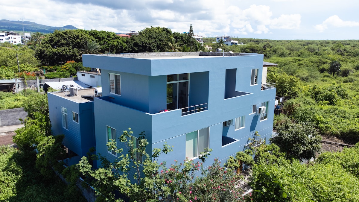 Ubicado en la terraza de uno de los edificios más altos de la isla, encontrarás una maravillosa vista todo el día. Muy fácil de localizar, en av. principal Baltra. Rodeado de restaurantes, tiendas y cajero automático Banco Pichincha cruzando la calle. A 4 cuadras de Terminal Terrestre y 3 cuadras de Mercado Municipal y parada de bus a zonas rurales. Privacidad en tu propia terraza abierta equipada con elementos para ejercitar, comedor y cocina con utensilios. Perfecto para reuniones.