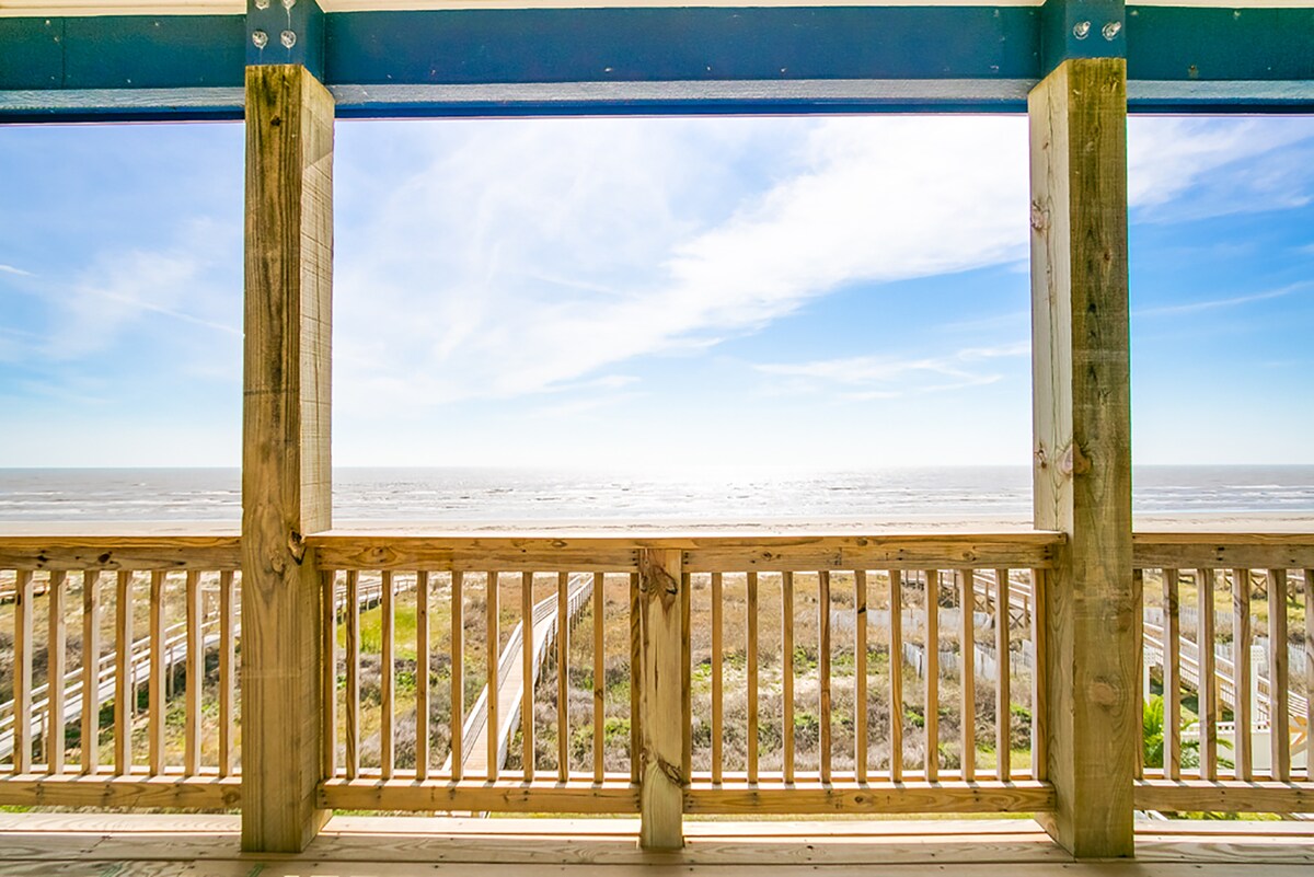 Vrij uitzicht op de oceaan! Zie helemaal het strand af naar Galveston. Vier slaapkamers en 3 1/2 badkamers. Veel ruimte en verschillende dekken om van de zon te genieten. Je hebt ruimte om je te vermaken, binnen het strandhuis , maar ook eronder waar je een grote ingebouwde bar vindt, propaan/houtskoolbar b q , schommels, hangmatloft en buitendouche. Omheind in de tuin. Eigen wandeling naar het strand. Gastronomische keuken met butlers pantry. Tv is in elke kamer. Master heeft een badkuip met uitzicht op het strand! Geschikt voor 14 personen