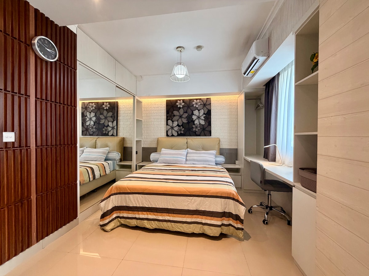 In de buurt van JIEXPO en JIS, onze studio in Maplepark appartement biedt modern comfort, snel internet en Netflix. De open indeling is voorzien van strakke meubels, veel natuurlijk licht en naadloos werkende en slaapruimtes. De goed uitgeruste kitchenette en het zachte slaapgedeelte zorgen voor comfort en functionaliteit. Met gemakkelijke toegang tot je evenementen en een eigen balkon met uitzicht op het zwembad, combineert deze studio stedelijke verfijning met gezellige charme, waardoor het de perfecte woning in het hart van Jakarta is.