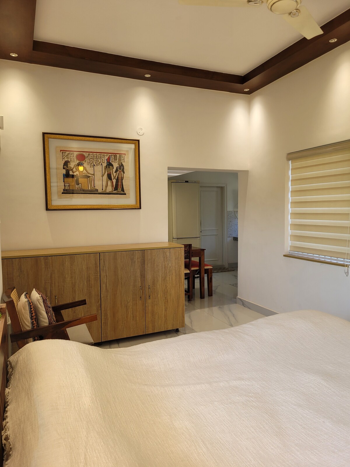 Dit open studio-appartement volgt minimalistische ontwerpprincipes. Deze ruimte is uitgerust met een kitchenette, twee badkamers, een groot kingsize bed, een queensize bed aan de muur, een tv met Netflix, Hotstar, PrimeVideo, JioCinema en gratis WiFi en is in staat om comfortabel een gezin van vier te ontvangen. LET OP: Dit is een open appartement en er zijn geen privéslaapkamers, het appartement bevindt zich op de tweede verdieping, dus je moet twee trappen op. Geen FEESTEN ALSJEBLIEFT 🙏🏽 EN niet ROKEN 🚭