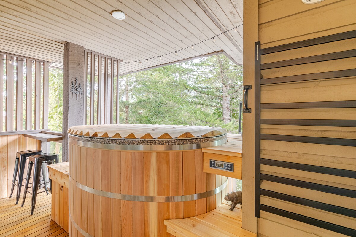 We hebben The Hideout bijgewerkt en verwelkomen de wereld graag aan het einde van de zomer van 2025!! The Hideout groeide uit een visie die we hadden toen we in 2020 naar de kust verhuisden. Met de wens om onze droom van het leven tussen de bomen te delen, weggestopt van de wereld, werd The Hideout gecreëerd. Deze ruimte is omhuld met handgefreesd cederhout, dennenhout en hemlockhout en ontworpen om ons eraan te herinneren om te vertragen, diep adem te halen en alles in ons op te nemen.