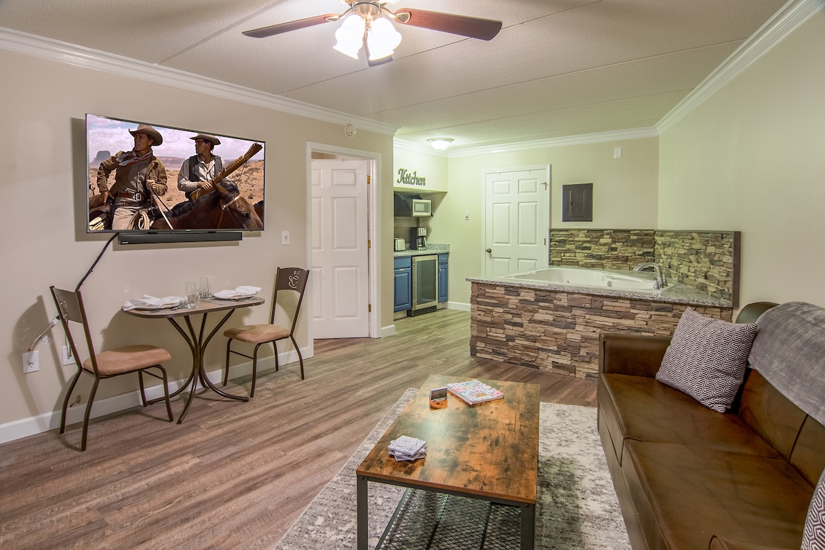 Kingsize bed! In kamer bubbelbad voor 2! Koppels HOUDEN VAN onze romantische ruimte. Loop overal heen! Prachtig “Gatlinburg Downtown Delight” designer appartement op de beste locatie! Loop naar winkels, pannenkoeken, aquarium, attracties, bars en restaurants. Slechts 2 blokken naar Anakeesta, Donut friar, dorpswinkels. Zo leuk en zo gemakkelijk: geen parkeergelegenheid/verkeerszorgen - gratis parkeren. 1 slaapkamer: Nieuw kingsize bed. Lederen slaapbank maakt een queensize bed - traagschuim comfortabel matras! Groot bubbelbad/whirlpool spa in de kamer voor 2 is een traktatie! Ga