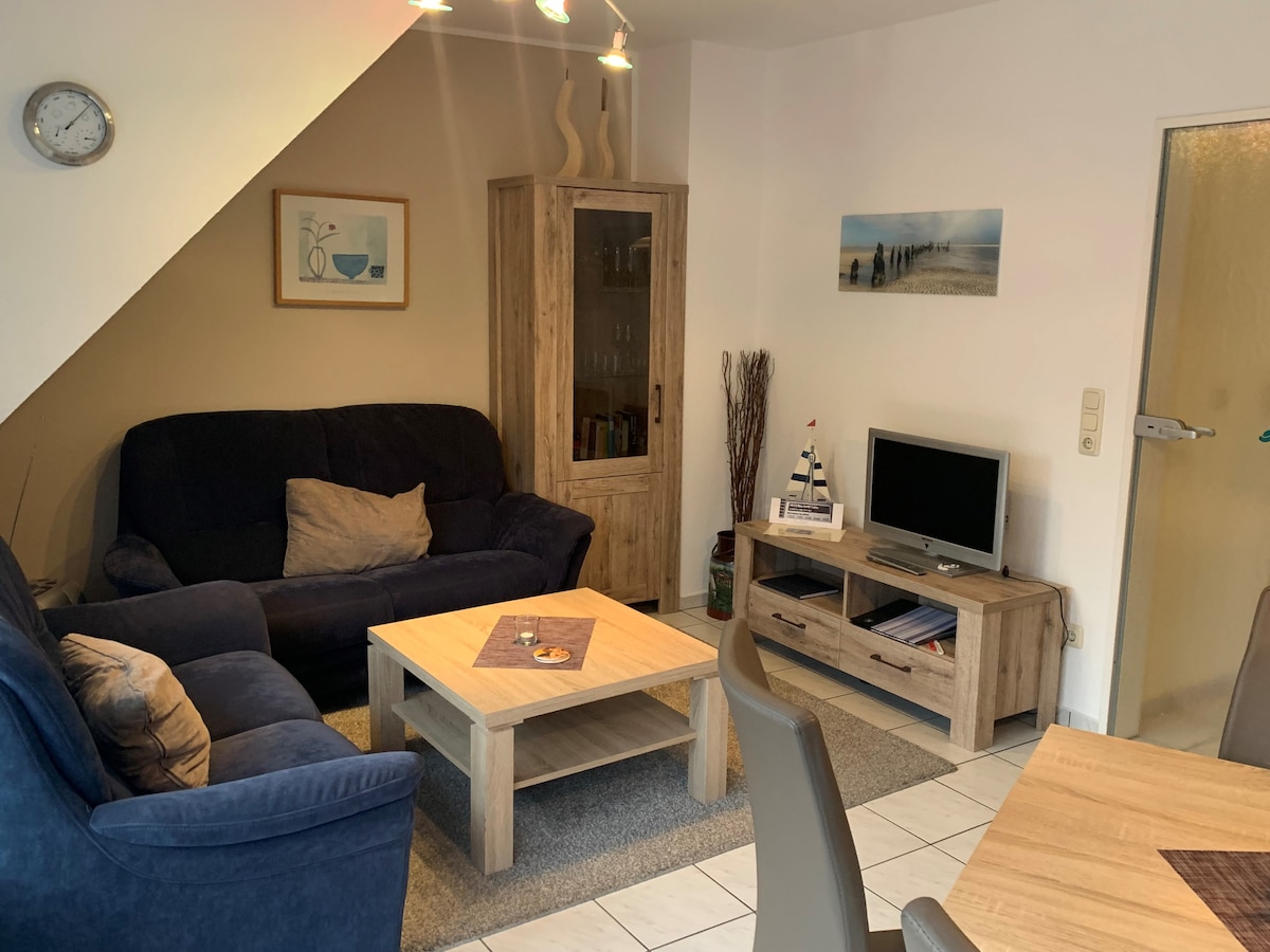 Ferienwohnung in Dangast: Platz für Zwei. Kurzer Fußweg zum Strand. Im Erdgeschoss befindet sich das Wohnzimmer mit gemütlicher Sofaecke zum Entspannen, eine Süd-Terrasse samt Sonnenschutz und Liegestühlen. In der Küche ist neben der üblichen Austattung mit Herd, Backofen und Kühlschrank eine Spülmaschine und eine Waschmaschine vorhanden. Im Obergeschoss befinden sich das Schlafzimmer und Badezimmer mit Dusche. Die Wohnung wurde im Jahr 2017 komplett saniert. Alles wie neu und bereit für euch.