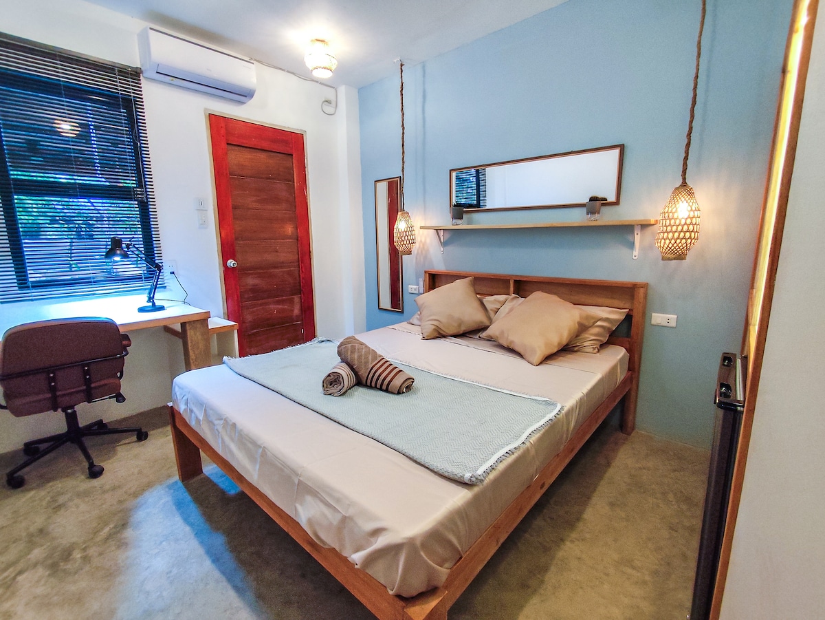 Verblijf in Eco Wooden House, je eigen rustieke houten huis omgeven door natuur — op slechts vijf minuten fietsen van General Luna. Je hebt de hele ruimte: twee slaapkamers (één tweepersoonskamer, één eenpersoonskamer), een eco-stijl badkamer, airconditioning in beide slaapkamers, snelle wifi, schoon beddengoed en handdoeken, en een volledig uitgeruste keuken met gasfornuis en waterdispenser. Geniet van de bamboe veranda met een hangmat en een rustige natuurlijke omgeving. Perfect voor reizigers of externe werknemers die op zoek zijn naar een betaalbaar en comfortabel verblijf.
