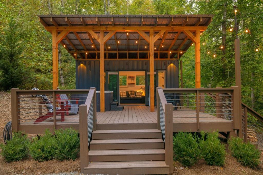Maak opnieuw verbinding met de natuur bij deze onvergetelijke ontsnapping op 3,7 hectare. Onze 40' zeecontainer is een bergretraite op 15 minuten van het centrum van Blue Ridge, GA. Geniet van de zonsopgang vanuit de queensize slaapkamer omgeven door glas. De woonkamer heeft een slaapbank en 55inch tv Geniet van een grote badkamer met inloopdouche en een keuken met koelkast, fornuis, broodroosteroven en magnetron. Stream films vanaf de projector op de gigantische overdekte veranda met uitzicht op het bos.