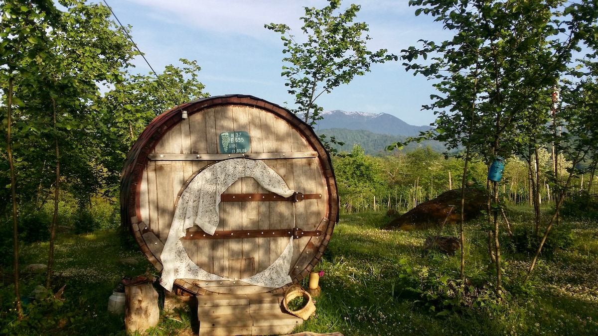 We zijn trots om onze unieke glamping plek "Diogenes Barrel" te presenteren; Hebben een comfortabel en filosofisch verblijf, terwijl omgeven door een wijngaard, hazelnoten, kleine theeplantage, bamboe bos, prive-stroom, en een prachtig uitzicht op de berg Gomi. Dit unieke verblijf is gelegen in West-Georgië, Guria, waar mensen altijd vrolijk en gastvrij zijn, de natuur subtropisch en groen is, rivieren snel en luidruchtig zijn en traditionele liedjes pittig zijn en nog steeds worden gezongen.
