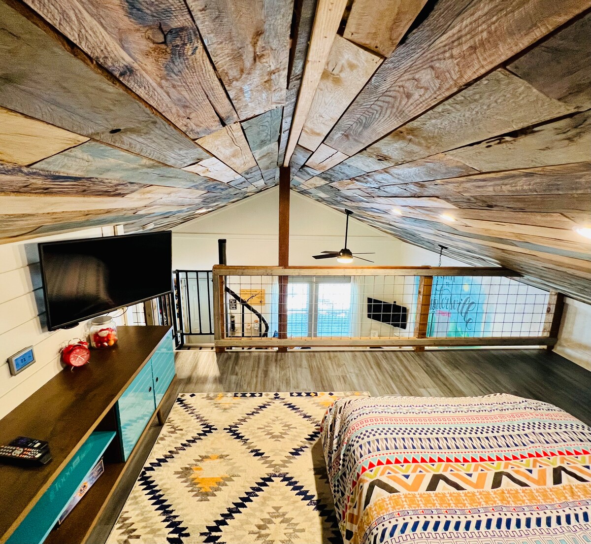 Lake Guntersville Tiny Home kingsize bed + open haard