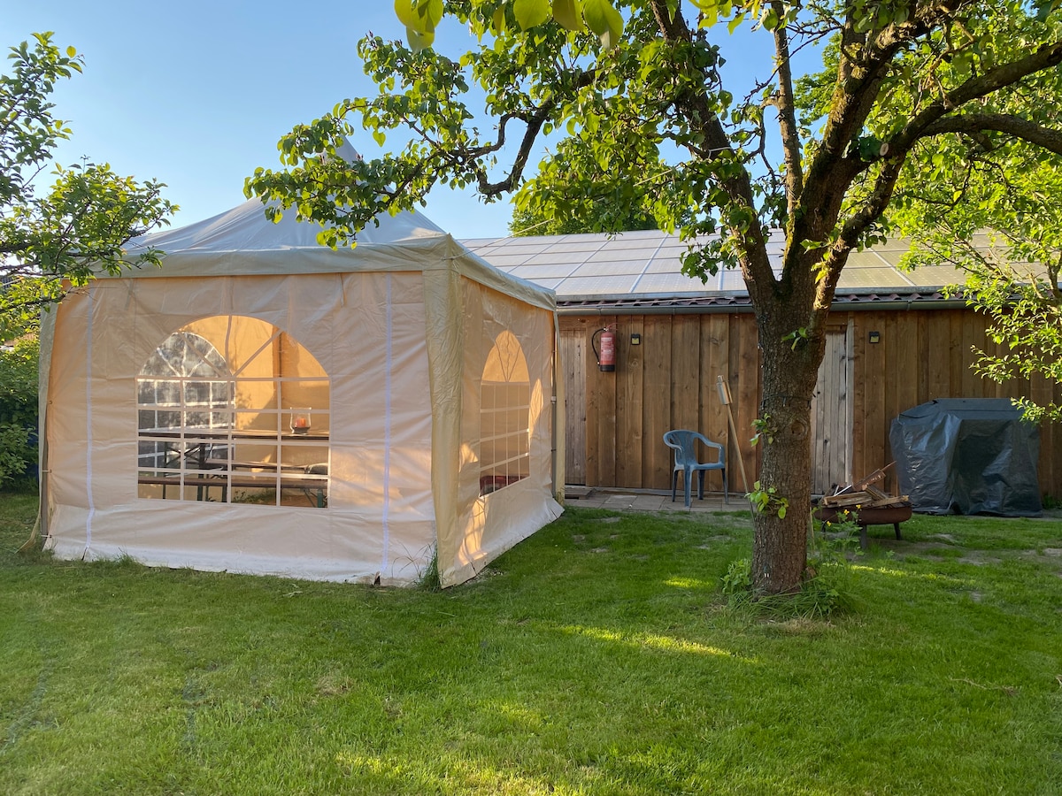 Dit privé gezellige huis in onze tuin heeft een eigen terras en alles wat een klein huis nodig heeft. Slechts 30 minuten van het centrum van München en 25 minuten naar het Oktoberfest rechtstreeks met de trein. Kinderen zijn welkom - extra babybedje geen probleem (we hebben 3 kinderen en houden van honden)