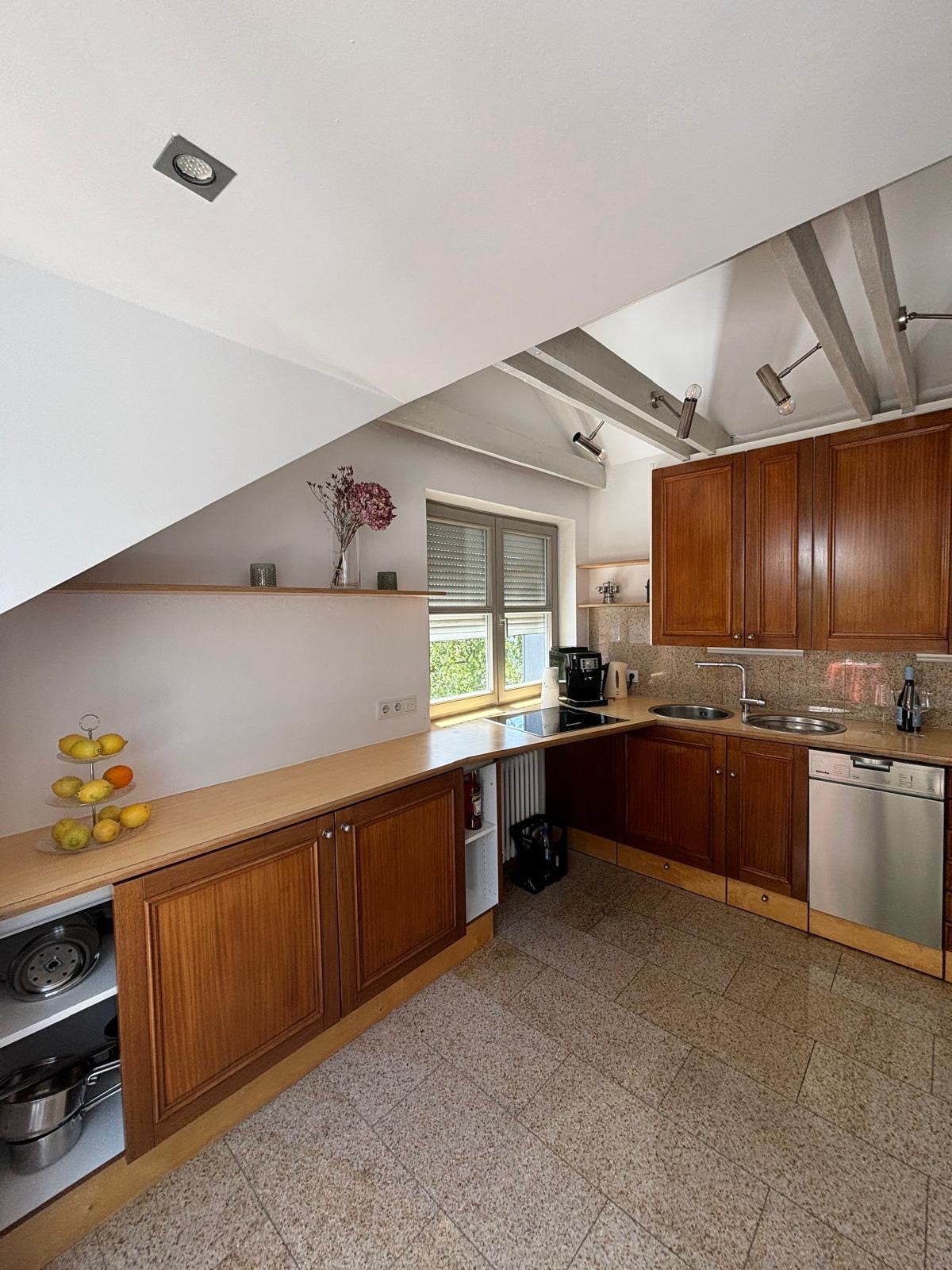 Stijlvolle loft oase in Gräfelfing, op slechts vijf minuten van de S-Bahn. Geniet van 80 m² comfort met een ruime woonkamer van 50 m², een enorme glazen gevel, een volledig uitgeruste moderne keuken en een werkruimte. Ontspan in de privésauna, bij de open haard of in de aparte slaapkamer. De groene tuin is perfect om tot rust te komen. Ideaal voor stellen, zakelijke reizigers en iedereen die van rust, design en sfeer houdt. Een perfecte mix van vintage, industrieel en modern comfort.