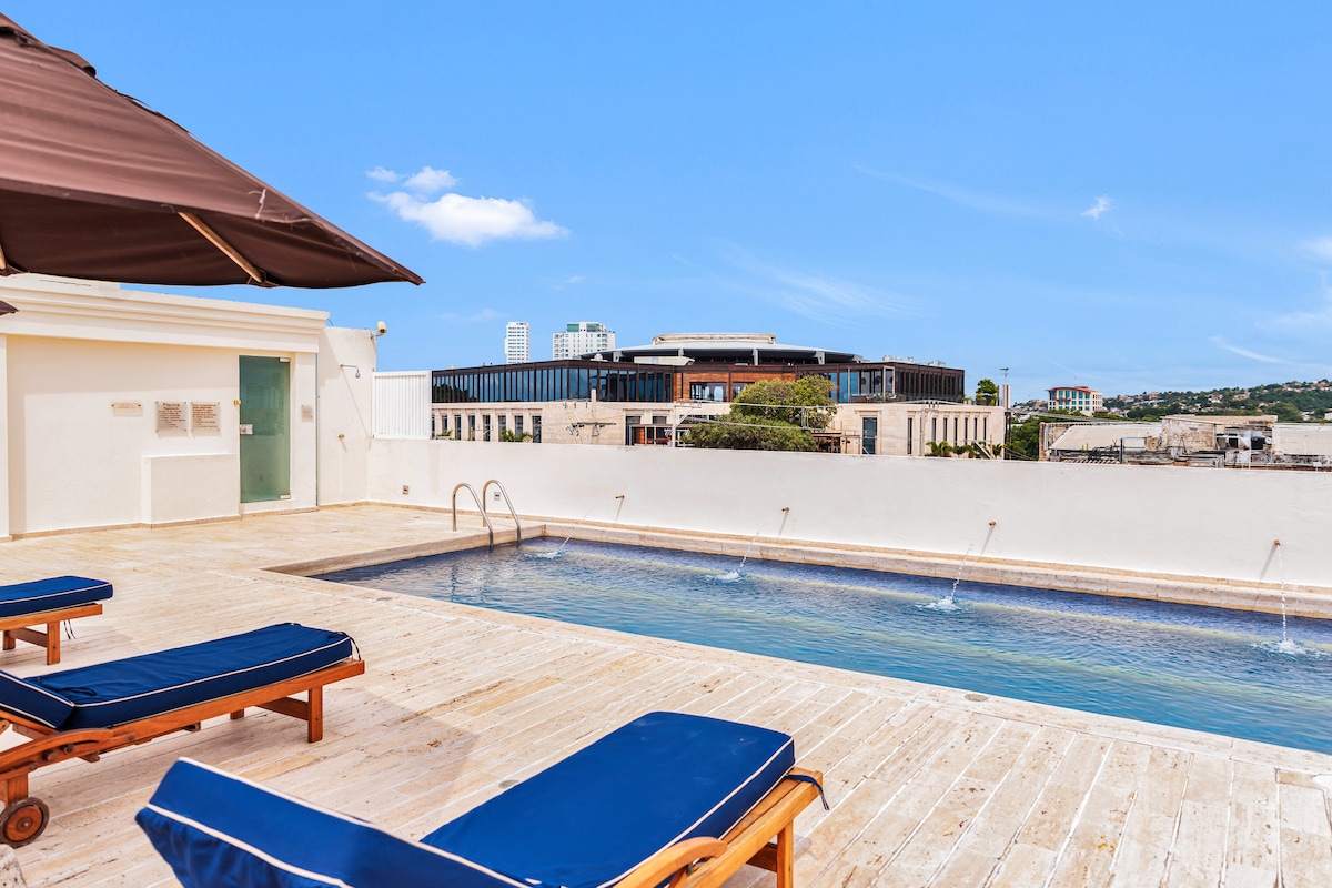 Boetiekstudio in een gerestaureerd 18e-eeuws herenhuis: op 1 blok van de kathedraal, omringd door de populairste pleinen van de oude stad. Een van de weinige accommodaties hier met een zwembad op de binnenplaats EN een bubbelbad op het dak (privétijdslots, uitzicht op de kathedraal bij zonsondergang). Voeg daarbij een 24-uursportier, krachtige airconditioning, snelle wifi en beddengoed van hotelkwaliteit — een echte zeldzaamheid in het historische centrum van Cartagena.
