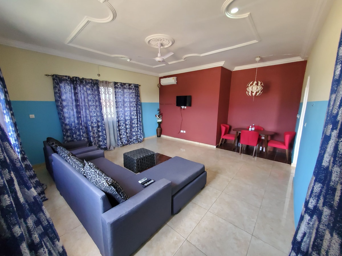 De hele groep heeft gemakkelijke toegang tot alles, van dit centraal gelegen appartement, dicht bij de Palace Mall, op 15 minuten rijden van Labadi Beach, de Accra Mall, East Legon en op 20 minuten van Osu. Met 3 ruime slaapkamers allemaal en-suite, kan elke gast genieten van hun privacy en komen ze samen in een luxe grote zitkamer met Smart TV, Netflix, wifi, muziek soundbar en aparte eethoek. Gasten zullen genieten van een ruim balkon en lokale voorzieningen. CCTV op het terrein.