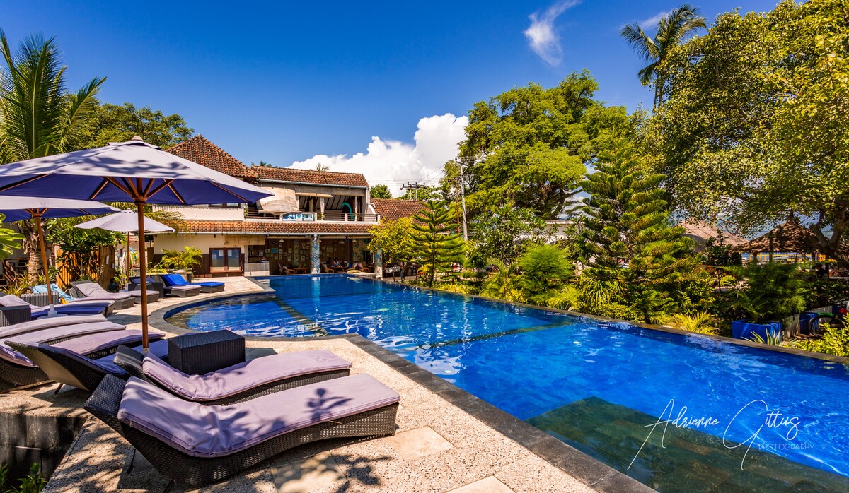 Mango Dive & Bungalow - Beach Side Resort & Dive Center - biedt 3 traditionele Lumbungs met airconditioning/ventilator, gedeeltelijk open badkamer en fris (maar geen warm) water. Het privéterras met hangmatten is omgeven door een prachtige tropische tuin. Het ligt op slechts een paar meter van ons strand. We bieden ook dagelijkse leuke duiken en cursussen van beginners tot professioneel niveau in meerdere talen.