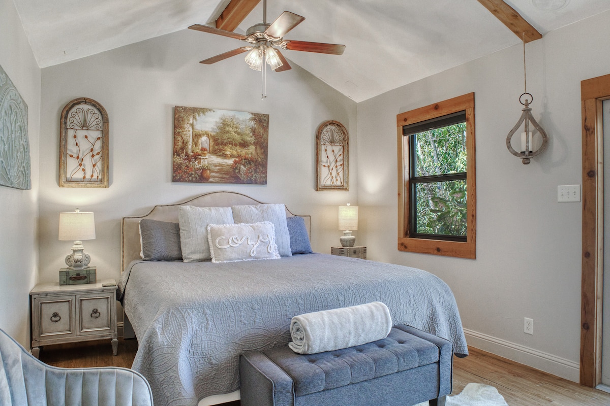 Ontsnap naar The Barn, een modern Hill Country-retraite in Fredericksburg, ontworpen voor comfort en ontspanning. Dit boetiekpension combineert rustieke charme met een eigentijdse stijl en heeft gewelfde plafonds, een gezellige open haard en een eigen binnenplaats. Ontspan in de kingsize slaapkamer met openslaande deuren, geniet van het bubbelbad of ontspan in het bubbelbad in de buitenlucht onder de sterren van Texas. The Barn ligt op slechts enkele minuten van Main Street en lokale wijngaarden en is de perfecte mix van afzondering en gemak.