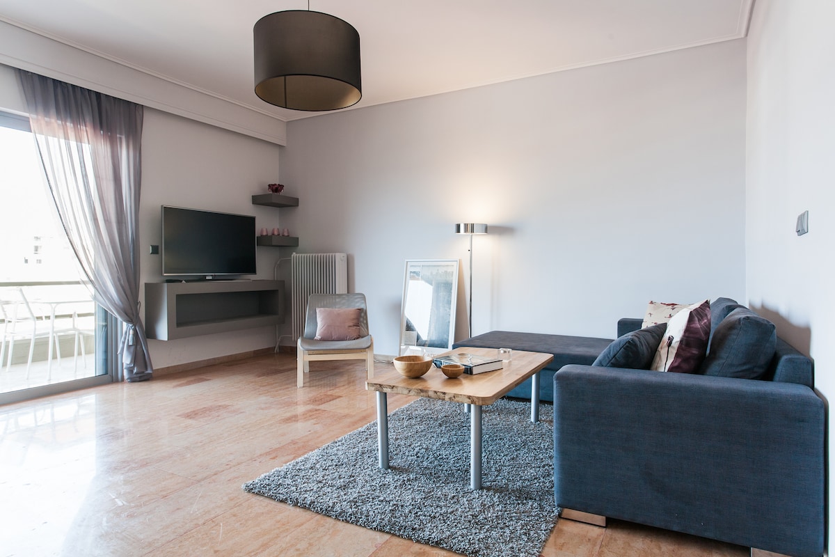 A comfortable, luminous 4th floor apartment (90 sq.mtrs/970 sq.ft), with a great panoramic view of the city of Athens, Acropolis, Lycabettus hill and the mountains. Earthly tones, bamboo touches and Indian ceramics set the vibe through a minimalistic, relaxing approach. The apartment is in the heart of Palaio Faliro area, also known as the Athenian Riviera where you can enjoy the delightful seaside (5' walk) or head to the centre of Athens through a 15' drive or using the Tram, Bus or Scooter.