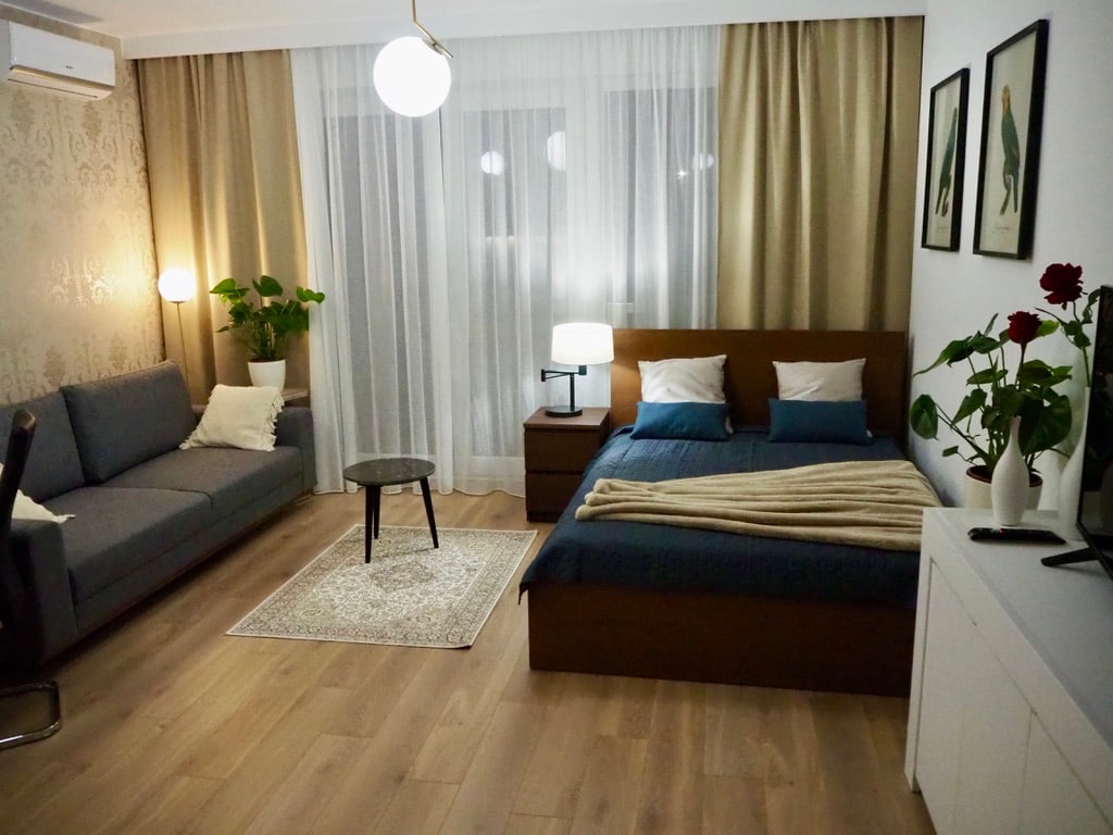 Ontworpen in hoge standaard, volledig uitgerust, gezellig appartement in een prestigieuze rustige wijk. TV (nieuws in het Engels, Frans etc.), gratis snelle wifi, parkeerplaats in de garage en een groot balkon :) Volledig uitgeruste kitchenette. Cots, restaurants, 24/7 fitnessruimte en supermarkt in de buurt. Perfect voor stellen, gezinnen met kinderen of zakenreizigers. Het is alsof je thuis bent:)