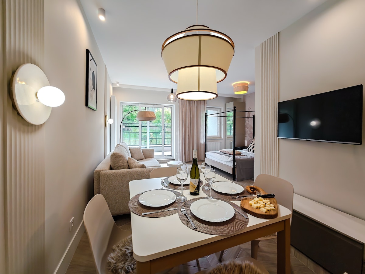 Vlekkeloos schoon en stijlvol appartement, omgeven door park in een korte nabijheid van het centrum. ✅️ Privéparkeerplaats inbegrepen ✅️Groot terras ✅️Lift ✅️Airconditioning ✅️Moderne kinderspeeltuin Het appartement beschikt over een moderne volledig uitgeruste keuken, woonkamer, ruime badkamer, slaapkamer met een kingsize bed en op afstand bedienbare jaloezieën. Nieuw wooncomplex in een rustige groene omgeving, net naast het park 'Lubomirskich'. Supermarkten en bushaltes op 5 minuten lopen en op loopafstand van het stadscentrum.