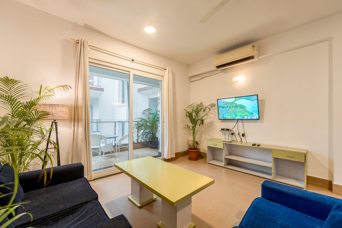 Modern Boho-appartement | Minuten van de stranden van Noord-Goa. Een gezellige, volledig ingerichte 1BHK-retraite op de begane grond, perfect voor stellen, vrienden of kleine gezinnen. Hoogtepunten: - Stijlvolle boho-interieurs met een warme sfeer - Airco in slaapkamer en woonkamer voor comfort - Smart-tv + snelle wifi - Uitgeruste keuken met RO-water, kookplaat, koelkast en wasmachine - Gedeeld zwembad (9.00 - 18.00 uur | badkleding verplicht - Fitnessruimte op het terrein beschikbaar voor INR 200/- per persoon per dag - 24/7 beveiliging - Gratis parkeren