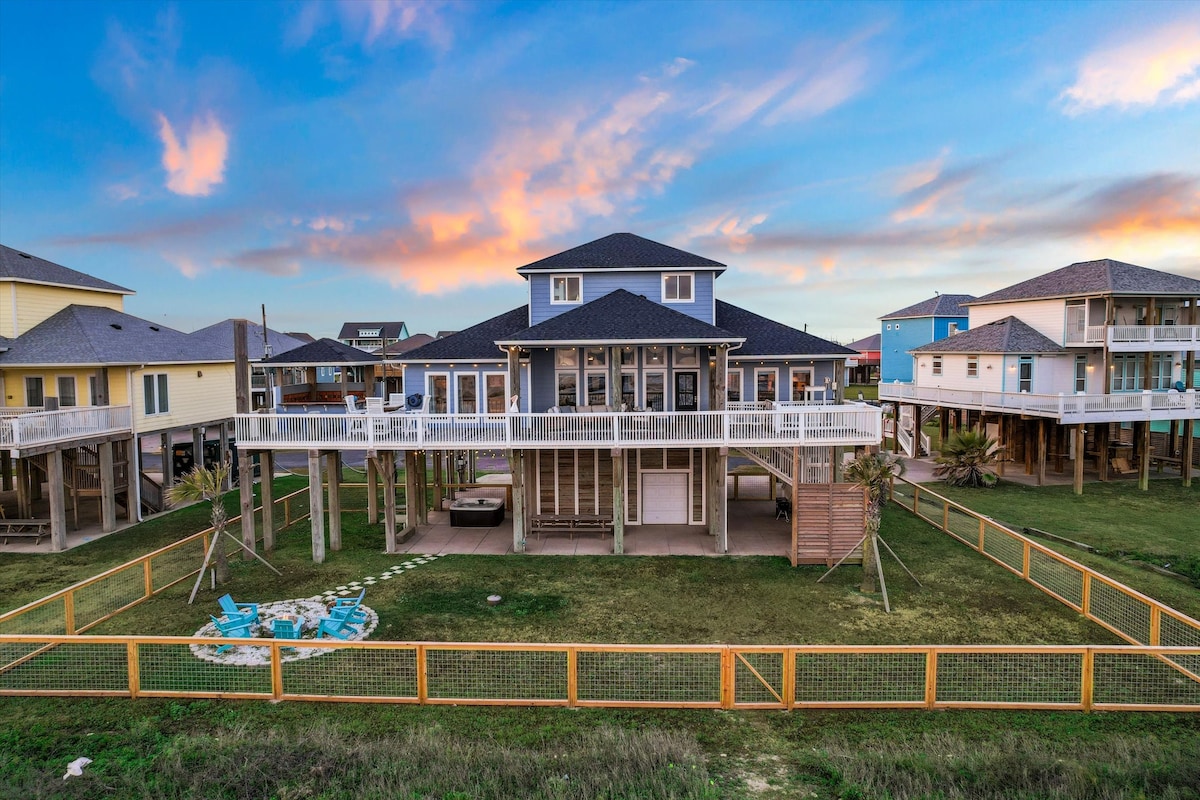 Loop in 1 minuut naar het strand. Uitzicht op het strand, een 7-persoons LED-hot tub, een groot terras met 12 zitplaatsen, een vuurplaats en een ruime tuin van een halve hectare. Kook buiten op de Blackstone, roker/grill of Breeo-grill. Buitendouche, snelle Starlink-wifi, smart-tv's, wasmachine/droger, parkeergelegenheid en een universele EV-oplader van niveau 2. Volledig gevuld, gezins- en huisdiervriendelijk Crystal Beach huis.