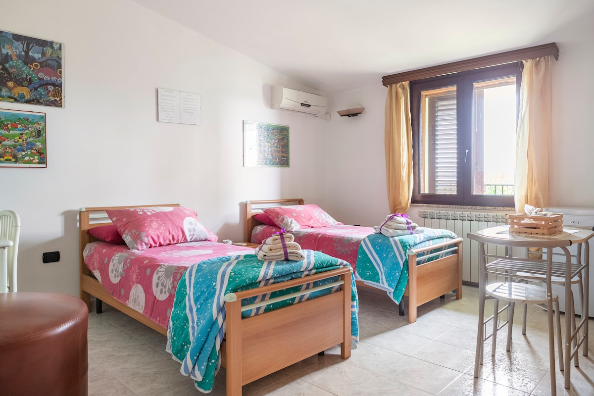 De B&B ligt in Bacu Abis, een mijndorp tussen Carbonia en Iglesias. Op slechts 3 km van de zee, in 10/15 minuten bereik je de mooiste stranden en baaien in ons gebied. De kust is rijk aan archeologische sites, mijnen en natuurlijke grotten. Vierpersoonskamer met airconditioning en een eigen badkamer, koelkast en waterkoker. Slaapkamer met een 2 eenpersoonsbed + een stapelbed.