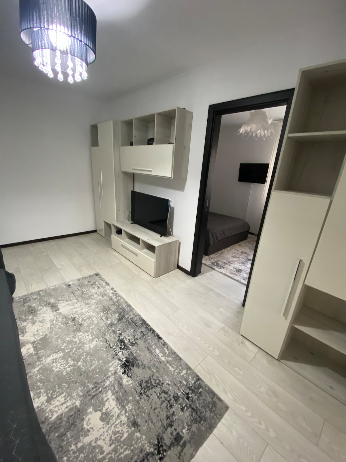 Modern Sudio met 2 kamers, gelegen in een rustige omgeving. Dit appartement is ideaal voor een gezin of een stel en biedt comfort dat thermisch en geluiddicht is. - Ruime woonkamer met slaapbank, flatscreen-tv - Slaapkamer met queensize bed, royale kledingkast - Open keuken, uitgerust met fornuis, oven, koelkast, wasmachine - Moderne badkamer met hydromassagedouche en radio - Nabij supermarkten, restaurants,koffiehuizen, parken,ziekenhuis - Betaalde parkeerplaatsen