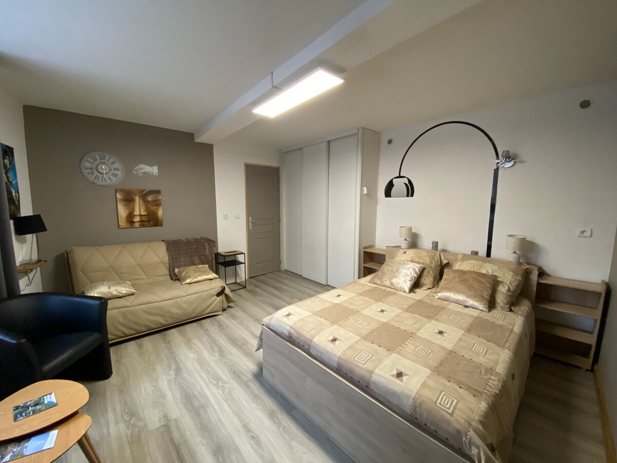 Volledig gerenoveerd appartement van 35 m², gelegen op 7 minuten lopen van het stadscentrum, de winkels, het historische centrum en op 2 minuten van een supermarkt en een wasserette. Dicht bij de spa. Ideaal voor een koppel, mogelijkheid tot 2 extra bedden op een comfortabele slaapbank. De ruimte heeft: - een woonkamer met smart-tv, wifi/glasvezel, slaapbank en uitschuifbare tafel, - een slaapkamer met kingsize bed, - een uitgeruste en functionele keuken, - badkamer voorzien van toilet