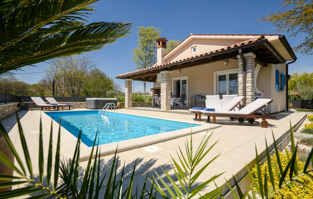 Discover Villa Mochi in Pićan, a luxurious 2-floor villa blending modern elegance with serene nature. The 205 sqm interior features 4 stylish bedrooms, each with a TV, 6 bathrooms, two dining areas, and a fully equipped kitchen. Outside, enjoy a private 900 sqm garden with a pristine pool, modern fountain, sunbeds, parasols, and a shaded terrace with a grill. Relax with air conditioning, free WiFi, a child cot, and safe parking.