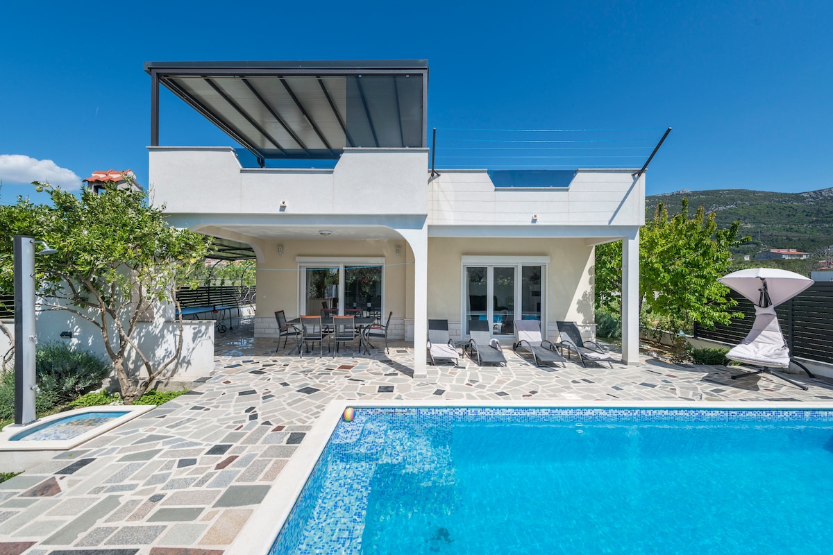 De villa bestaat uit twee verdiepingen, verbonden door een interne trap. Op de begane grond is er een woonkamer met uitgang en uitzicht op het zwembad, keuken met uitgang naar een overdekte buitenbarbecue ,een badkamer en kamer en een eigen badkamer Op de eerste etage zijn 3 kamers, een galerie met uitzicht op de lucht en de badkamer. Buiten is er een zwembad, een ligweide, een douche, een jacuzzi en een trampoline. Het huis heeft 4 parkeerplaatsen, Split is 16 km, luchthaven 3 km, Trogir 13 km, strand zeer dichtbij,Bus, apotheek, markt, bakkerij 100m.