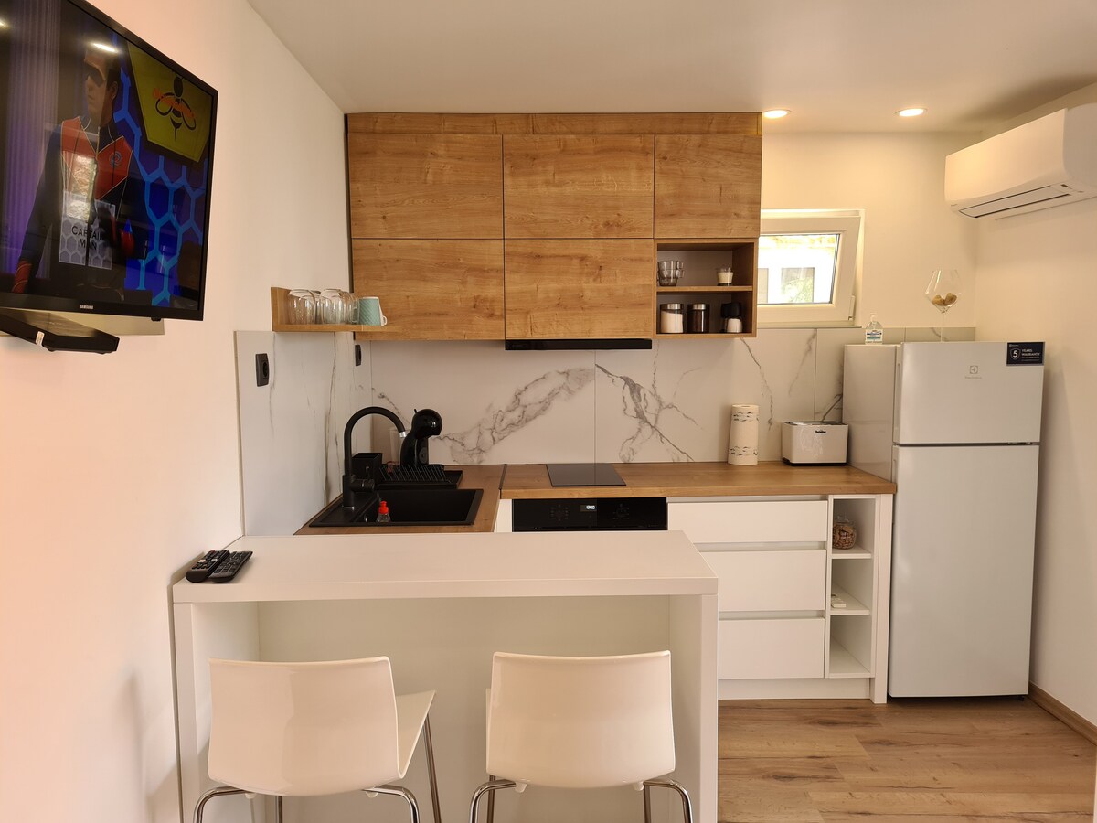 Het appartement bestaat uit een slaapkamer, een woonkamer met een slaapbank, ideaal voor een volwassene of kinderen tot 12 jaar. De volledig uitgeruste keuken met een kook- en eettafel maakt het mogelijk om op verzoek van de gast gerechten te bereiden van ontbijt, lunch en diner. Een complete badkamer met ligbad, klein balkon en een groot terras met ligstoelen en parasols maken deze ruimte compleet voor zowel een kortere als langere vakantie.
